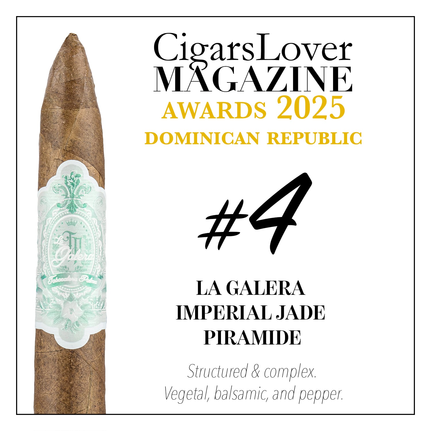 Jose “Jochy” Blanco’s first venture into the difficult-to-source and highly sought-after African-grown Cameroon for La Galera resulted in the birth of the Imperial Jade line. They are made at his Tabacalera Palma factory, in Tamboril. This Piramide highlights the wrapper’s unique character, with a harmonious evolution from start to finish.