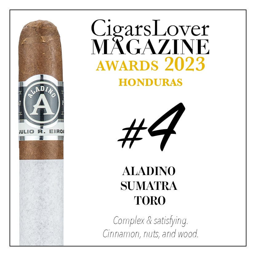 The Aladino Sumatra introduces a more modern design to the brand due to the fourth generation of the Eiroa family playing a more prominent role in this release. This Honduran puro is made entirely from tobaccos grown by the family. This cigar reveals a broad flavor profile that gradually increases in strength, making for a satisfying smoking experience.