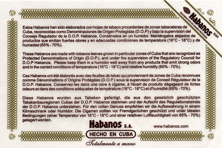 1. in 2005 the English text was slightly modified: a space was added after the indication on the storage temperature of the cigars.