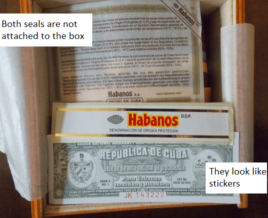 Usually there are seals placed inside the box. These seals must be attached to the box and not simply inserted into it on adhesive paper. In counterfeit Cohiba boxes, this error is almost always made. (See pictures at the bottom of the page).