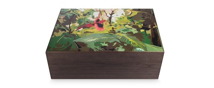 The top of the humidor depicts a vivid vermilion colored bird, that soars over the Caribbean Forrest and the tobacco therein cultivated; the inside of the humidor is made out of Gabon wood, better known as Okoume, completely taste- and odorless, to avoid any transfers of taste/odor on to the cigar. Every humidor is equipped with three Davidoff De Luxe humidifiers, that guarantee a stable humidity between 70 and 72%.