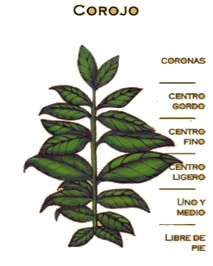 The levels of the Corojo, from which the leaves for the wrapper are obtained, ordered from the bottom up, are Libre de Pie, Uno y Medio, Centro Ligero, Centro Fino, Centro Gordo and Coronas.
