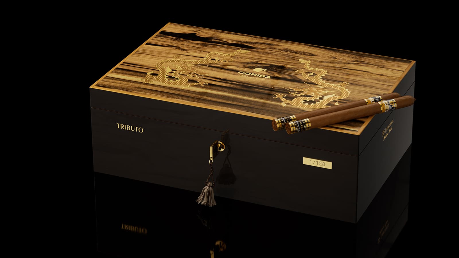 Only 128 numbered humidors will be sold, making it a unique and exclusive launch. Each humidor contains 55 Cohiba Lanceros (38 x 192 mm—7 1/2”) rolled in the El Laguito factory. The cigars are presented with the brand’s original cigar band and an additional foot band designed exclusively for this launch. The foot band features the vitola’s name in gold over the iconic Cohiba grid, adorned with elegant dragons.