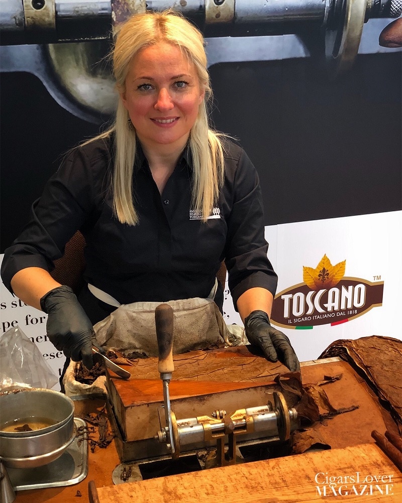 Also Toscano presents “Made in Italy” to the entire World, featuring one of the most open, welcoming and elegant booth, featuring the evocative image of a Sigaraia rolling cigars in front of people.